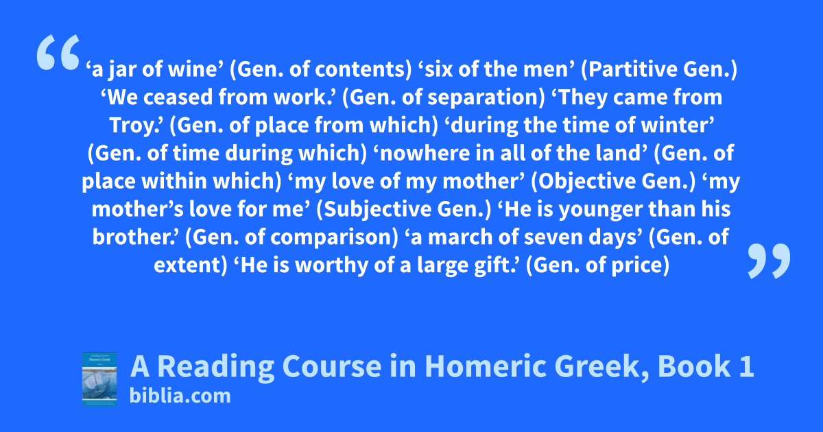 ‘a jar of wine’ (Gen. of contents) ‘six of the men’ (Partitive Gen.) ‘We ceased from work.’ (Gen. of separation) ‘They came from Troy.’ (Gen. of place from which) ‘during the time of winter’ (Gen. of time during which) ‘nowhere in all of the land’ (Gen. of place within which) ‘my love of my mother’ (Objective Gen.) ‘my mother’s love for me’ (Subjective Gen.) ‘He is younger than his brother.’ (Gen. of comparison) ‘a march of seven days’ (Gen. of extent) ‘He is worthy of a large gift.’ (Gen. of price)