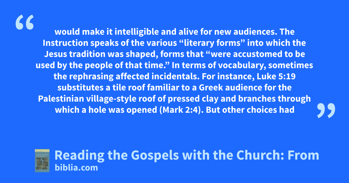 would make it intelligible and alive for new audiences. The Instruction speaks of the various “literary forms” into which the Jesus tradition was shaped, forms that “were accustomed to be used by the people of that time.” In terms of vocabulary, sometimes the rephrasing affected incidentals. For instance, Luke 5:19 substitutes a tile roof familiar to a Greek audience for the Palestinian village-style roof of pressed clay and branches through which a hole was opened (Mark 2:4). But other choices had