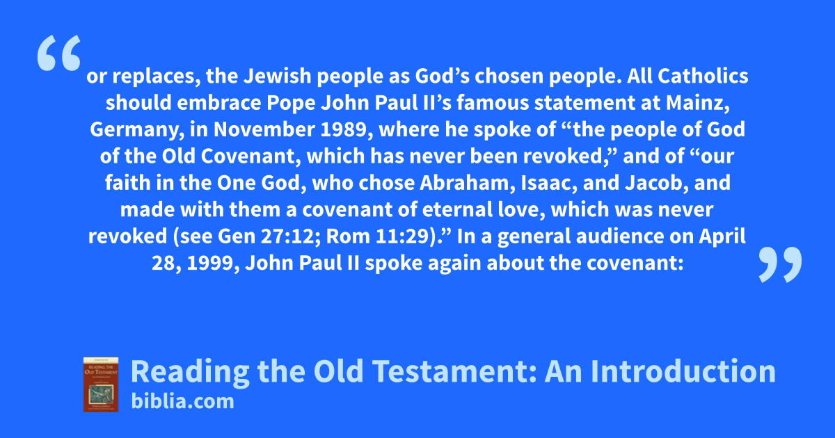 or replaces, the Jewish people as God’s chosen people. All Catholics should embrace Pope John Paul II’s famous statement at Mainz, Germany, in November 1989, where he spoke of “the people of God of the Old Covenant, which has never been revoked,” and of “our faith in the One God, who chose Abraham, Isaac, and Jacob, and made with them a covenant of eternal love, which was never revoked (see Gen 27:12; Rom 11:29).” In a general audience on April 28, 1999, John Paul II spoke again about the covenant: