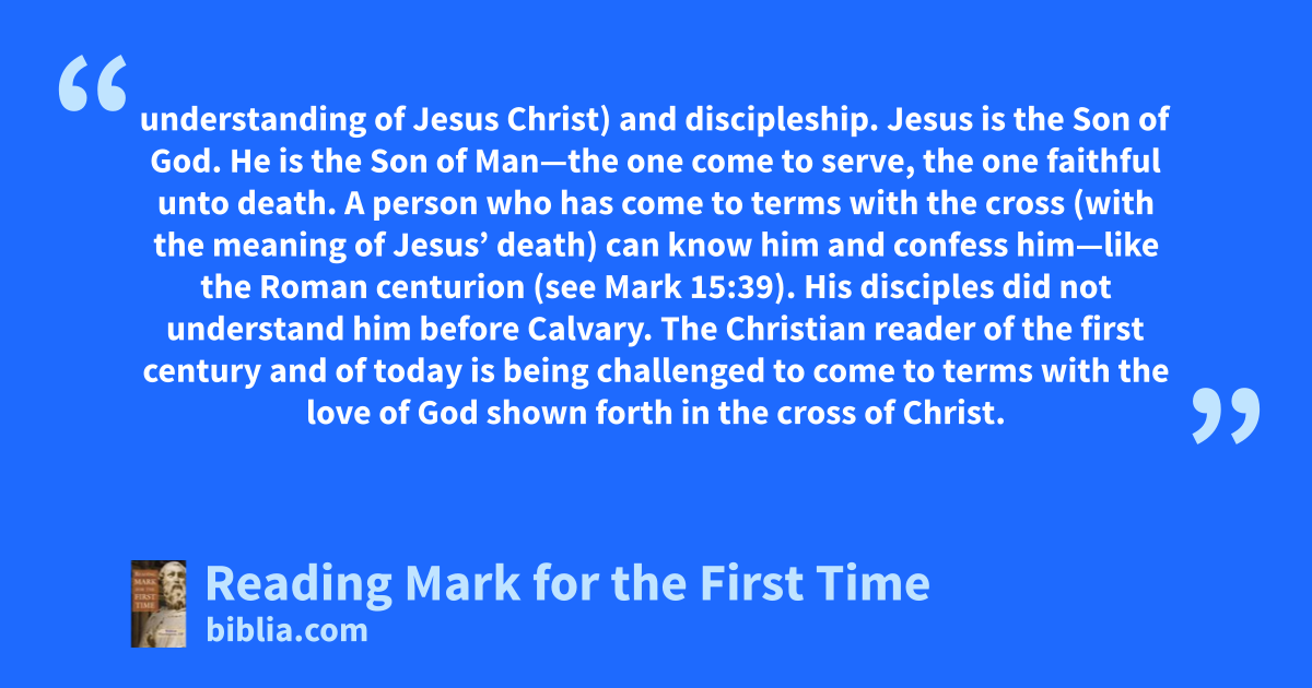 understanding of Jesus Christ) and discipleship. Jesus is the Son of God. He is the Son of Man—the one come to serve, the one faithful unto death. A person who has come to terms with the cross (with the meaning of Jesus’ death) can know him and confess him—like the Roman centurion (see Mark 15:39). His disciples did not understand him before Calvary. The Christian reader of the first century and of today is being challenged to come to terms with the love of God shown forth in the cross of Christ.