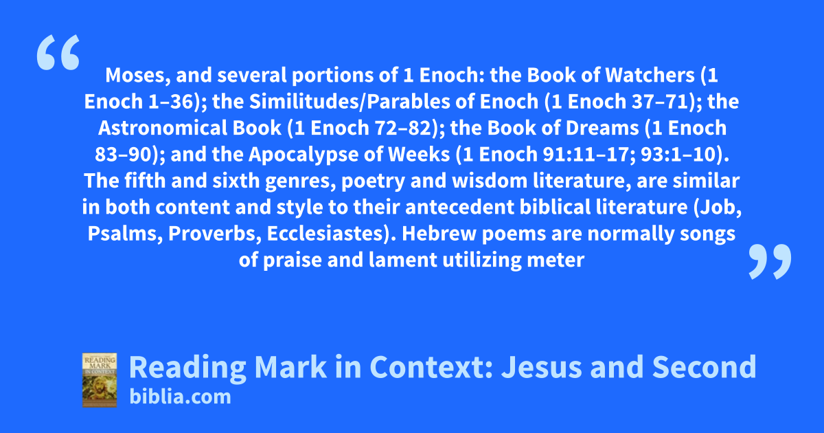 Moses, and several portions of 1 Enoch: the Book of Watchers (1 Enoch 1–36); the Similitudes/Parables of Enoch (1 Enoch 37–71); the Astronomical Book (1 Enoch 72–82); the Book of Dreams (1 Enoch 83–90); and the Apocalypse of Weeks (1 Enoch 91:11–17; 93:1–10). The fifth and sixth genres, poetry and wisdom literature, are similar in both content and style to their antecedent biblical literature (Job, Psalms, Proverbs, Ecclesiastes). Hebrew poems are normally songs of praise and lament utilizing meter