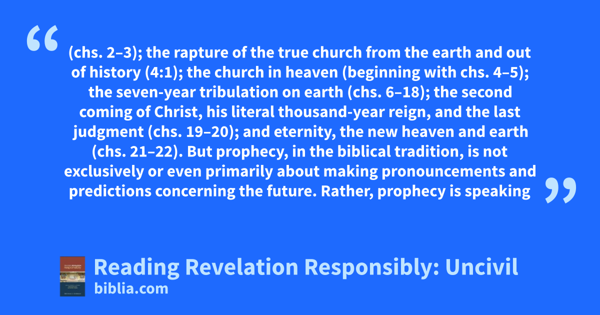 (chs. 2–3); the rapture of the true church from the earth and out of history (4:1); the church in heaven (beginning with chs. 4–5); the seven-year tribulation on earth (chs. 6–18); the second coming of Christ, his literal thousand-year reign, and the last judgment (chs. 19–20); and eternity, the new heaven and earth (chs. 21–22). But prophecy, in the biblical tradition, is not exclusively or even primarily about making pronouncements and predictions concerning the future. Rather, prophecy is speaking