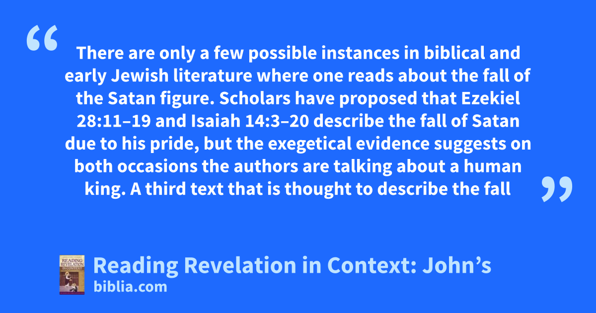 There are only a few possible instances in biblical and early Jewish literature where one reads about the fall of the Satan figure. Scholars have proposed that Ezekiel 28:11–19 and Isaiah 14:3–20 describe the fall of Satan due to his pride, but the exegetical evidence suggests on both occasions the authors are talking about a human king. A third text that is thought to describe the fall
