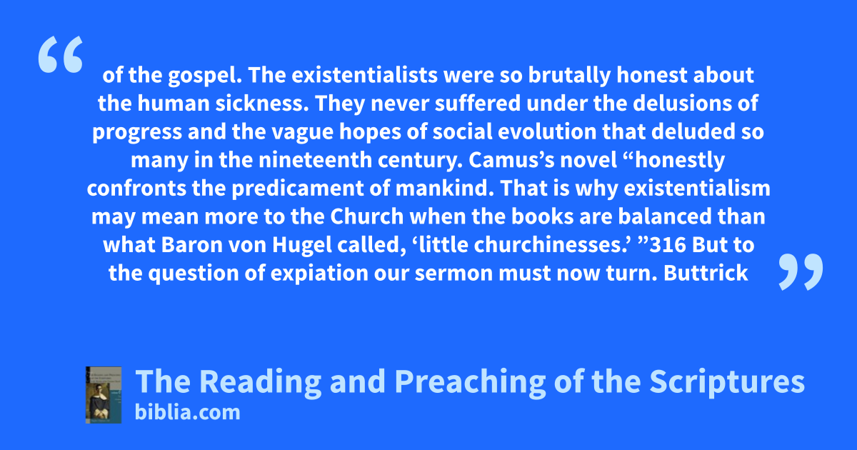 of the gospel. The existentialists were so brutally honest about the human sickness. They never suffered under the delusions of progress and the vague hopes of social evolution that deluded so many in the nineteenth century. Camus’s novel “honestly confronts the predicament of mankind. That is why existentialism may mean more to the Church when the books are balanced than what Baron von Hugel called, ‘little churchinesses.’ ”316 But to the question of expiation our sermon must now turn. Buttrick