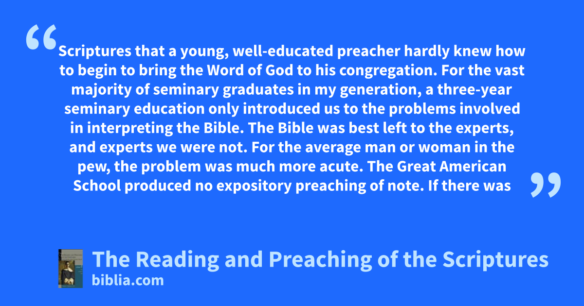 Scriptures that a young, well-educated preacher hardly knew how to begin to bring the Word of God to his congregation. For the vast majority of seminary graduates in my generation, a three-year seminary education only introduced us to the problems involved in interpreting the Bible. The Bible was best left to the experts, and experts we were not. For the average man or woman in the pew, the problem was much more acute. The Great American School produced no expository preaching of note. If there was