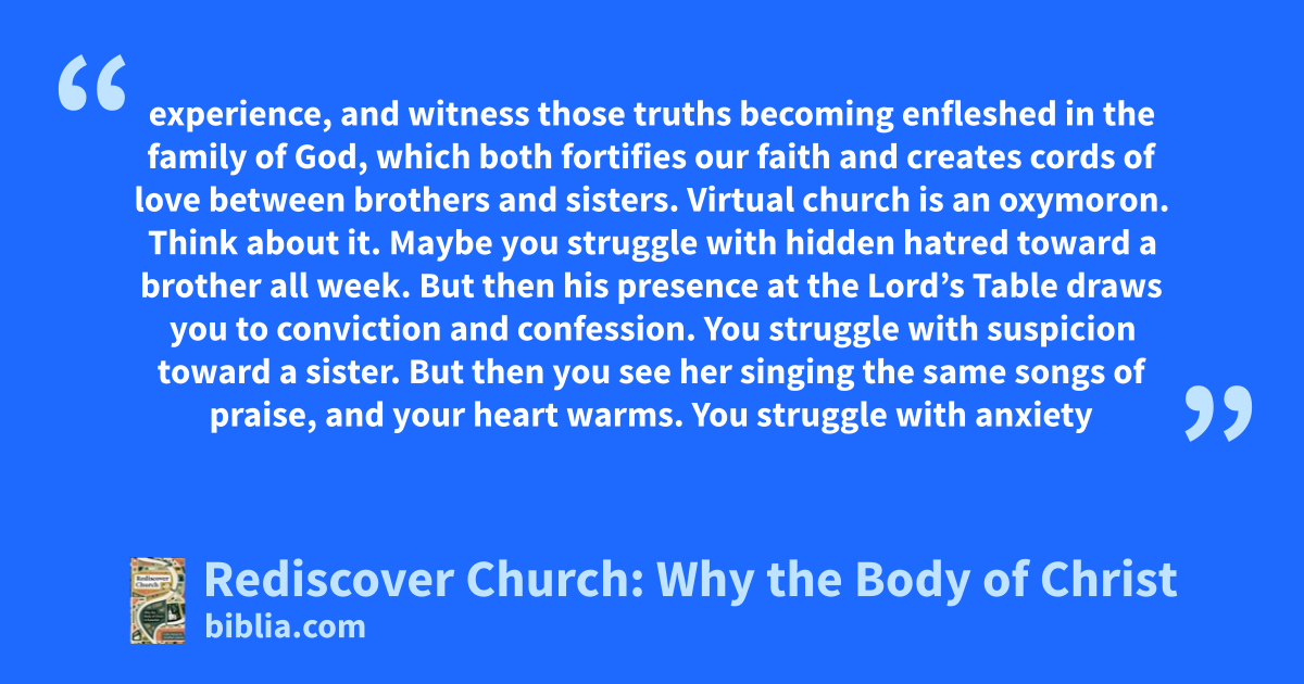 experience, and witness those truths becoming enfleshed in the family of God, which both fortifies our faith and creates cords of love between brothers and sisters. Virtual church is an oxymoron. Think about it. Maybe you struggle with hidden hatred toward a brother all week. But then his presence at the Lord’s Table draws you to conviction and confession. You struggle with suspicion toward a sister. But then you see her singing the same songs of praise, and your heart warms. You struggle with anxiety
