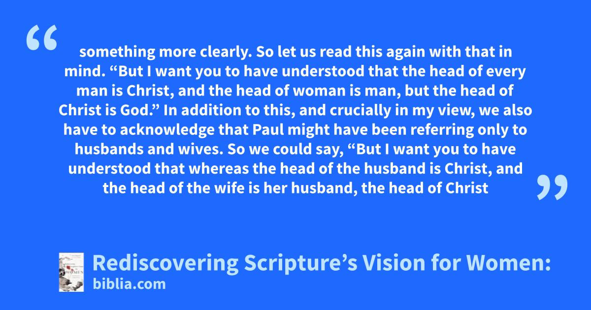 something more clearly. So let us read this again with that in mind. “But I want you to have understood that the head of every man is Christ, and the head of woman is man, but the head of Christ is God.” In addition to this, and crucially in my view, we also have to acknowledge that Paul might have been referring only to husbands and wives. So we could say, “But I want you to have understood that whereas the head of the husband is Christ, and the head of the wife is her husband, the head of Christ
