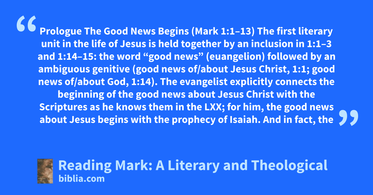 Prologue The Good News Begins (Mark 1:1–13) The first literary unit in the life of Jesus is held together by an inclusion in 1:1–3 and 1:14–15: the word “good news” (euangelion) followed by an ambiguous genitive (good news of/about Jesus Christ, 1:1; good news of/about God, 1:14). The evangelist explicitly connects the beginning of the good news about Jesus Christ with the Scriptures as he knows them in the LXX; for him, the good news about Jesus begins with the prophecy of Isaiah. And in fact, the