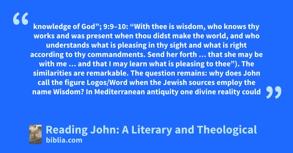 knowledge of God”; 9:9–10: “With thee is wisdom, who knows thy works and was present when thou didst make the world, and who understands what is pleasing in thy sight and what is right according to thy commandments. Send her forth … that she may be with me … and that I may learn what is pleasing to thee”). The similarities are remarkable. The question remains: why does John call the figure Logos/Word when the Jewish sources employ the name Wisdom? In Mediterranean antiquity one divine reality could