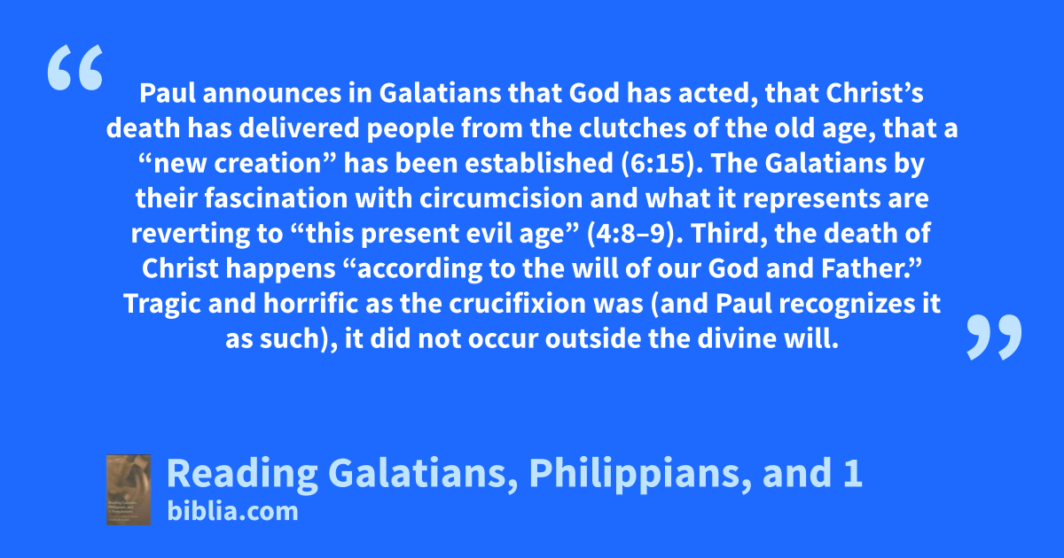 Paul announces in Galatians that God has acted, that Christ’s death has delivered people from the clutches of the old age, that a “new creation” has been established (6:15). The Galatians by their fascination with circumcision and what it represents are reverting to “this present evil age” (4:8–9). Third, the death of Christ happens “according to the will of our God and Father.” Tragic and horrific as the crucifixion was (and Paul recognizes it as such), it did not occur outside the divine will.