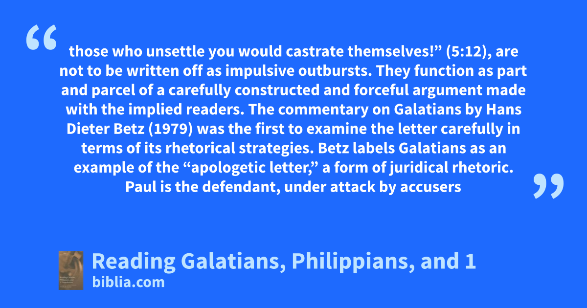 those who unsettle you would castrate themselves!” (5:12), are not to be written off as impulsive outbursts. They function as part and parcel of a carefully constructed and forceful argument made with the implied readers. The commentary on Galatians by Hans Dieter Betz (1979) was the first to examine the letter carefully in terms of its rhetorical strategies. Betz labels Galatians as an example of the “apologetic letter,” a form of juridical rhetoric. Paul is the defendant, under attack by accusers
