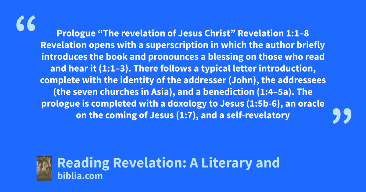 Prologue “The revelation of Jesus Christ” Revelation 1:1–8 Revelation opens with a superscription in which the author briefly introduces the book and pronounces a blessing on those who read and hear it (1:1–3). There follows a typical letter introduction, complete with the identity of the addresser (John), the addressees (the seven churches in Asia), and a benediction (1:4–5a). The prologue is completed with a doxology to Jesus (1:5b-6), an oracle on the coming of Jesus (1:7), and a self-revelatory