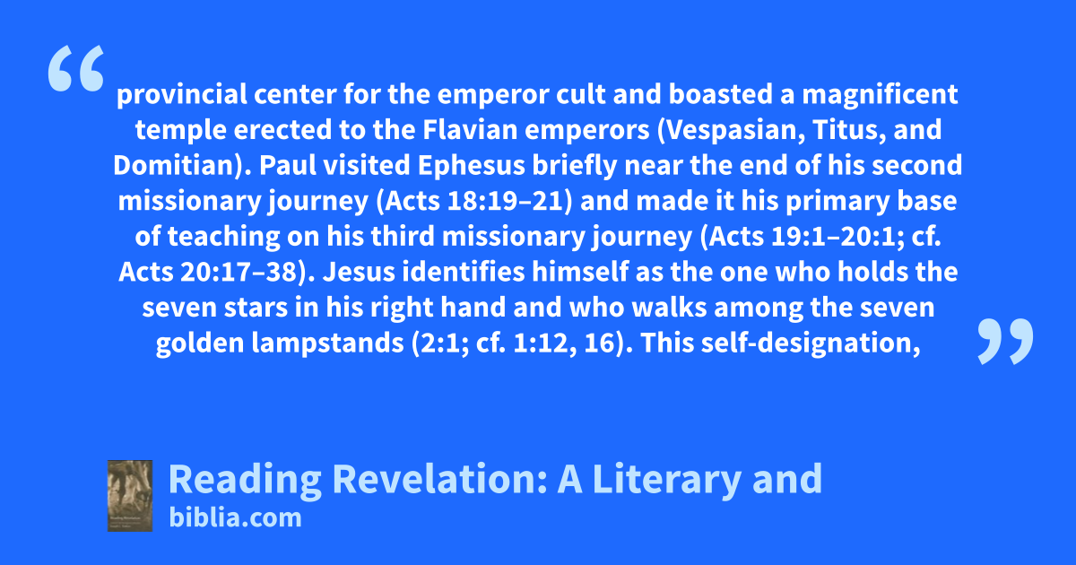 provincial center for the emperor cult and boasted a magnificent temple erected to the Flavian emperors (Vespasian, Titus, and Domitian). Paul visited Ephesus briefly near the end of his second missionary journey (Acts 18:19–21) and made it his primary base of teaching on his third missionary journey (Acts 19:1–20:1; cf. Acts 20:17–38). Jesus identifies himself as the one who holds the seven stars in his right hand and who walks among the seven golden lampstands (2:1; cf. 1:12, 16). This self-designation,