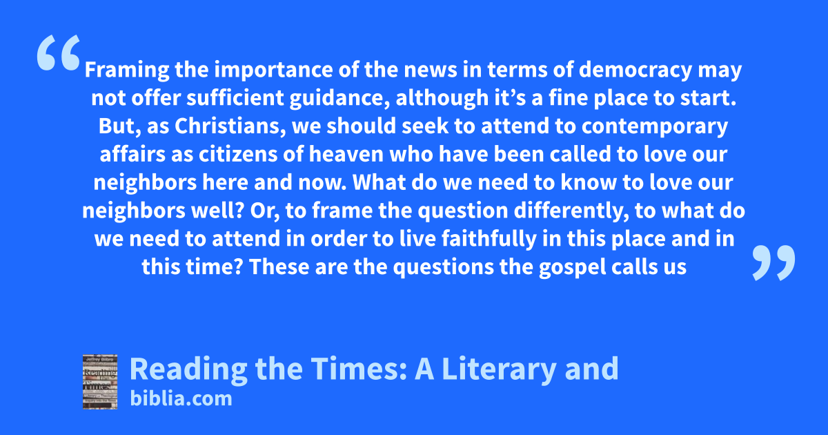Framing the importance of the news in terms of democracy may not offer sufficient guidance, although it’s a fine place to start. But, as Christians, we should seek to attend to contemporary affairs as citizens of heaven who have been called to love our neighbors here and now. What do we need to know to love our neighbors well? Or, to frame the question differently, to what do we need to attend in order to live faithfully in this place and in this time? These are the questions the gospel calls us