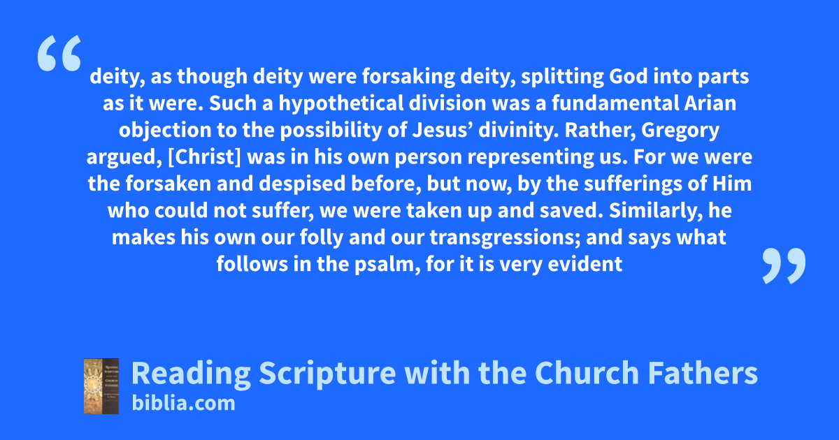 deity, as though deity were forsaking deity, splitting God into parts as it were. Such a hypothetical division was a fundamental Arian objection to the possibility of Jesus’ divinity. Rather, Gregory argued, [Christ] was in his own person representing us. For we were the forsaken and despised before, but now, by the sufferings of Him who could not suffer, we were taken up and saved. Similarly, he makes his own our folly and our transgressions; and says what follows in the psalm, for it is very evident