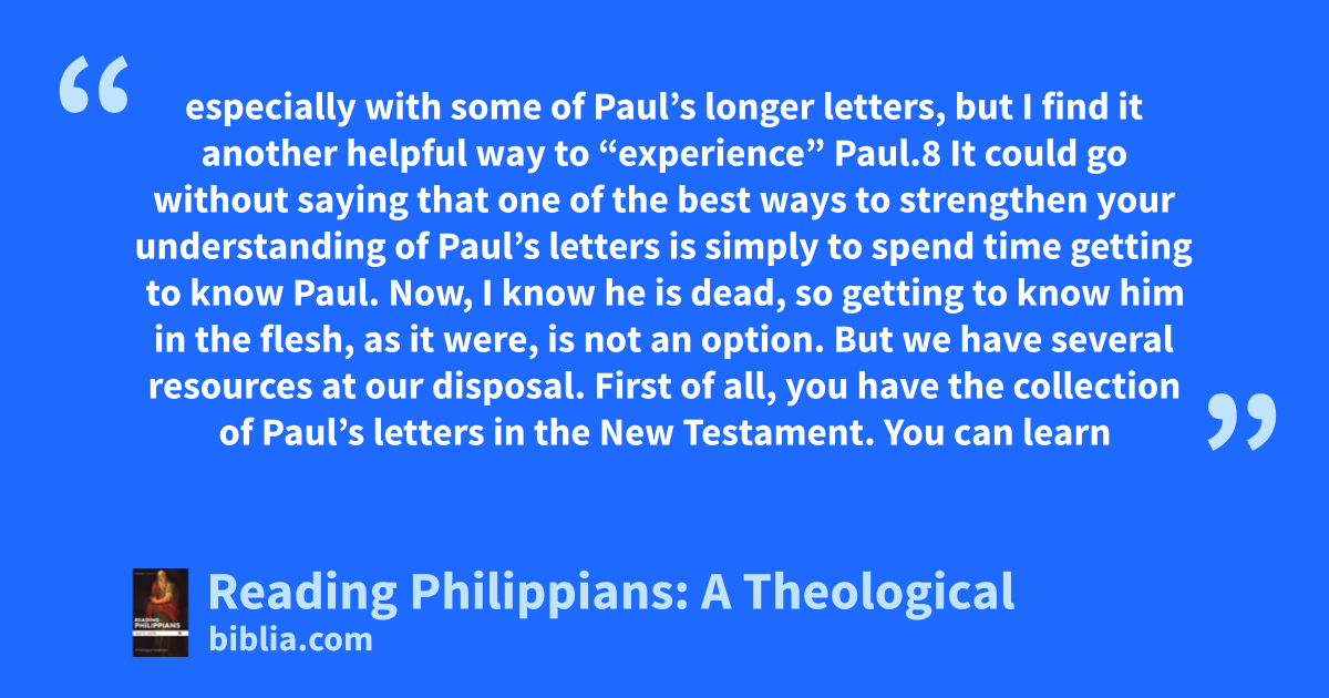 especially with some of Paul’s longer letters, but I find it another helpful way to “experience” Paul.8 It could go without saying that one of the best ways to strengthen your understanding of Paul’s letters is simply to spend time getting to know Paul. Now, I know he is dead, so getting to know him in the flesh, as it were, is not an option. But we have several resources at our disposal. First of all, you have the collection of Paul’s letters in the New Testament. You can learn
