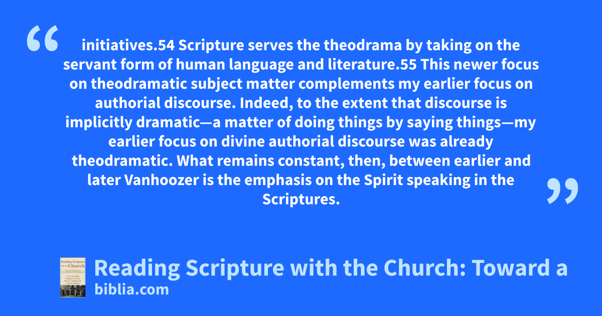 initiatives.54 Scripture serves the theodrama by taking on the servant form of human language and literature.55 This newer focus on theodramatic subject matter complements my earlier focus on authorial discourse. Indeed, to the extent that discourse is implicitly dramatic—a matter of doing things by saying things—my earlier focus on divine authorial discourse was already theodramatic. What remains constant, then, between earlier and later Vanhoozer is the emphasis on the Spirit speaking in the Scriptures.