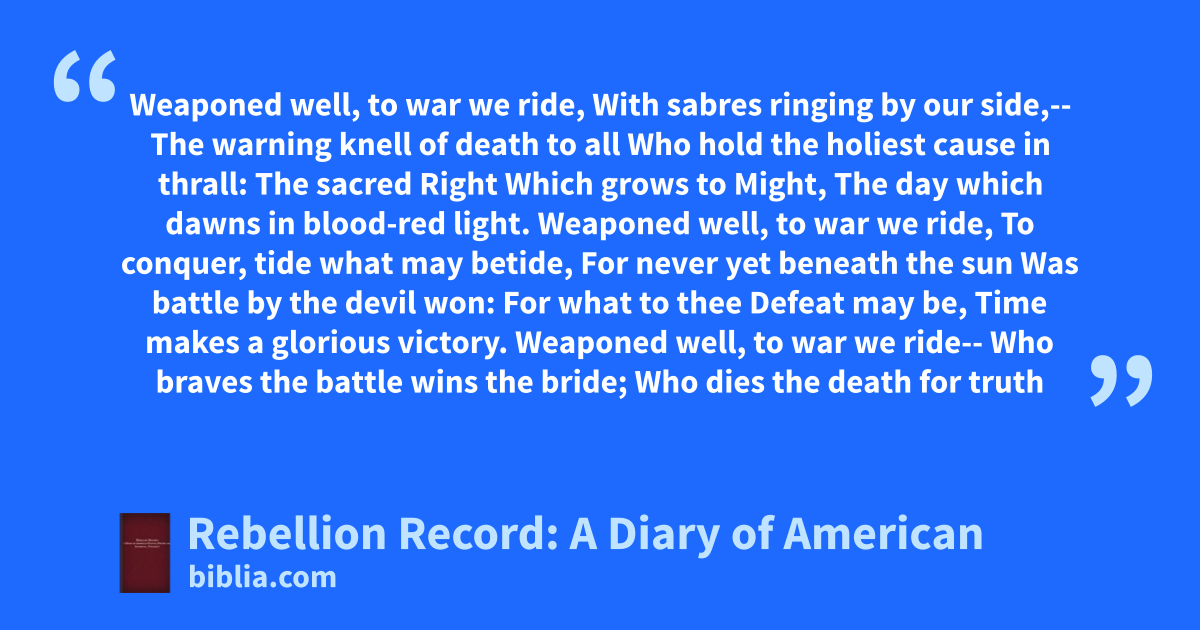 Weaponed well, to war we ride, With sabres ringing by our side,-- The warning knell of death to all Who hold the holiest cause in thrall: The sacred Right Which grows to Might, The day which dawns in blood-red light. Weaponed well, to war we ride, To conquer, tide what may betide, For never yet beneath the sun Was battle by the devil won: For what to thee Defeat may be, Time makes a glorious victory. Weaponed well, to war we ride-- Who braves the battle wins the bride; Who dies the death for truth