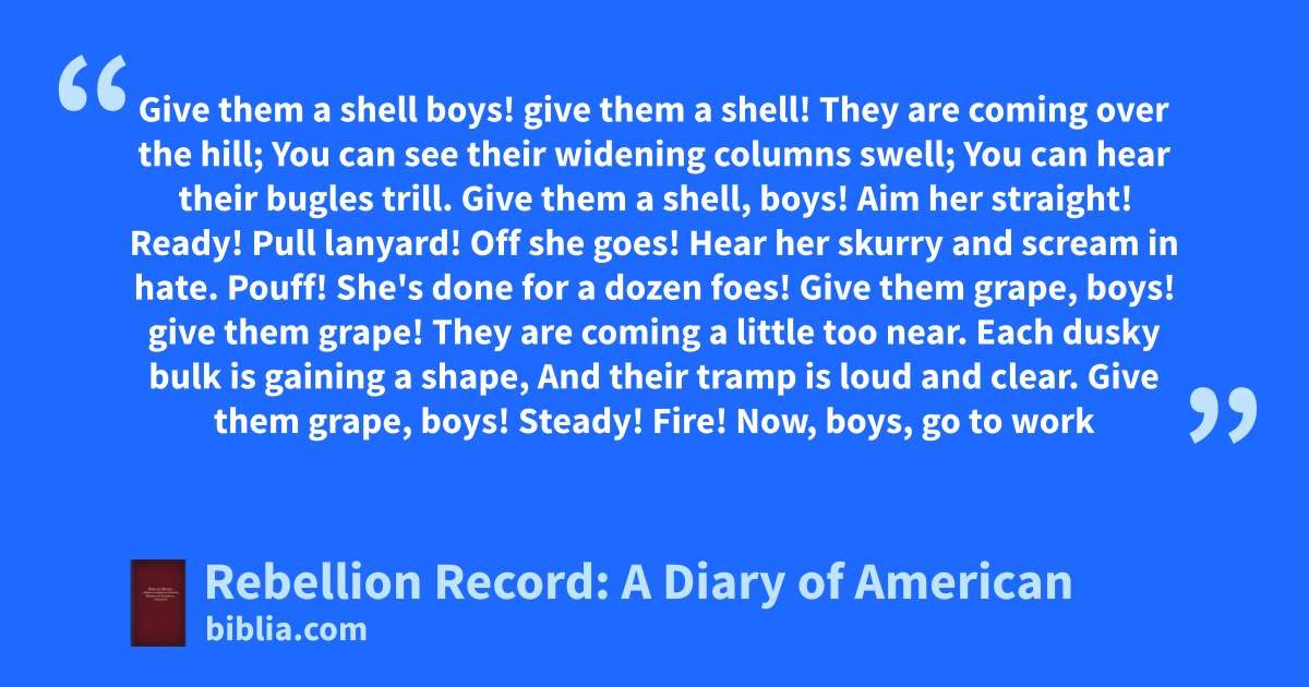 Give them a shell boys! give them a shell! They are coming over the hill; You can see their widening columns swell; You can hear their bugles trill. Give them a shell, boys! Aim her straight! Ready! Pull lanyard! Off she goes! Hear her skurry and scream in hate. Pouff! She's done for a dozen foes! Give them grape, boys! give them grape! They are coming a little too near. Each dusky bulk is gaining a shape, And their tramp is loud and clear. Give them grape, boys! Steady! Fire! Now, boys, go to work
