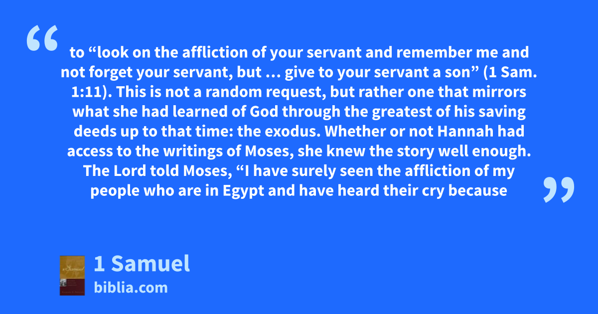 to “look on the affliction of your servant and remember me and not forget your servant, but … give to your servant a son” (1 Sam. 1:11). This is not a random request, but rather one that mirrors what she had learned of God through the greatest of his saving deeds up to that time: the exodus. Whether or not Hannah had access to the writings of Moses, she knew the story well enough. The Lord told Moses, “I have surely seen the affliction of my people who are in Egypt and have heard their cry because