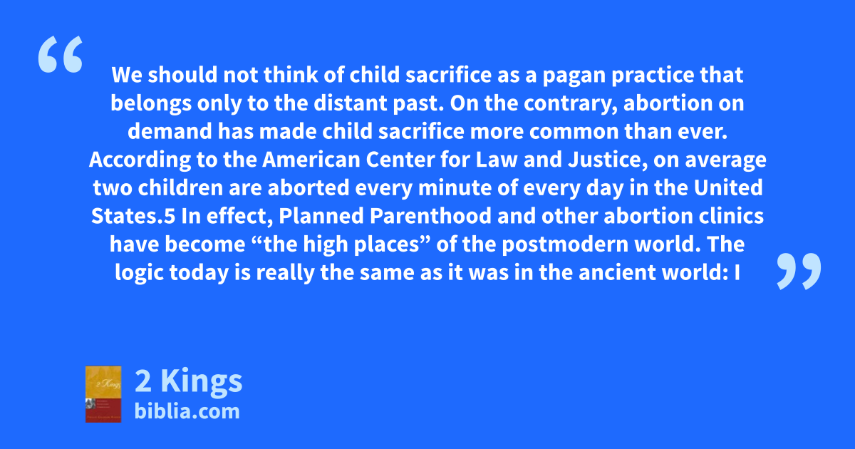 We should not think of child sacrifice as a pagan practice that belongs only to the distant past. On the contrary, abortion on demand has made child sacrifice more common than ever. According to the American Center for Law and Justice, on average two children are aborted every minute of every day in the United States.5 In effect, Planned Parenthood and other abortion clinics have become “the high places” of the postmodern world. The logic today is really the same as it was in the ancient world: I