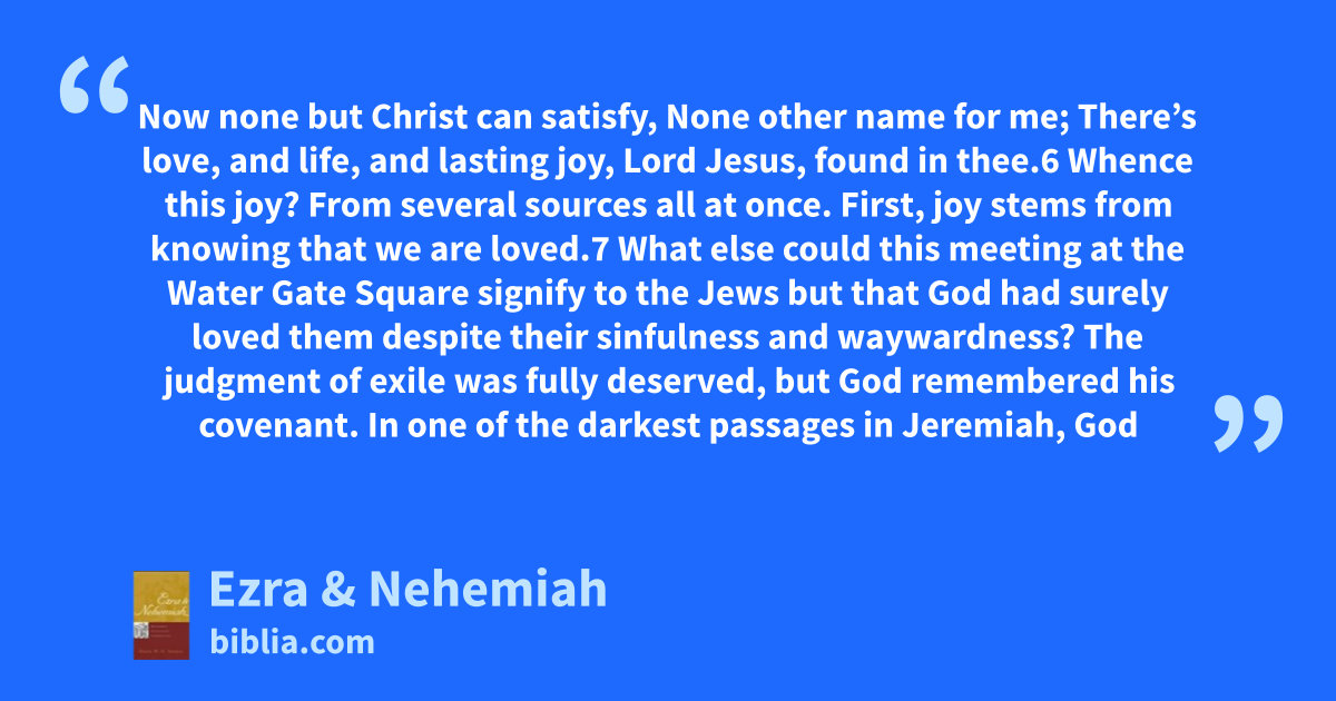 Now none but Christ can satisfy, None other name for me; There’s love, and life, and lasting joy, Lord Jesus, found in thee.6 Whence this joy? From several sources all at once. First, joy stems from knowing that we are loved.7 What else could this meeting at the Water Gate Square signify to the Jews but that God had surely loved them despite their sinfulness and waywardness? The judgment of exile was fully deserved, but God remembered his covenant. In one of the darkest passages in Jeremiah, God