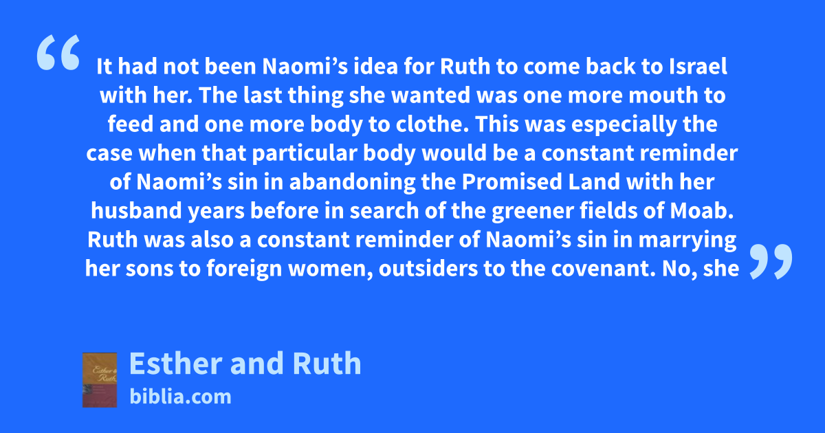 It had not been Naomi’s idea for Ruth to come back to Israel with her. The last thing she wanted was one more mouth to feed and one more body to clothe. This was especially the case when that particular body would be a constant reminder of Naomi’s sin in abandoning the Promised Land with her husband years before in search of the greener fields of Moab. Ruth was also a constant reminder of Naomi’s sin in marrying her sons to foreign women, outsiders to the covenant. No, she