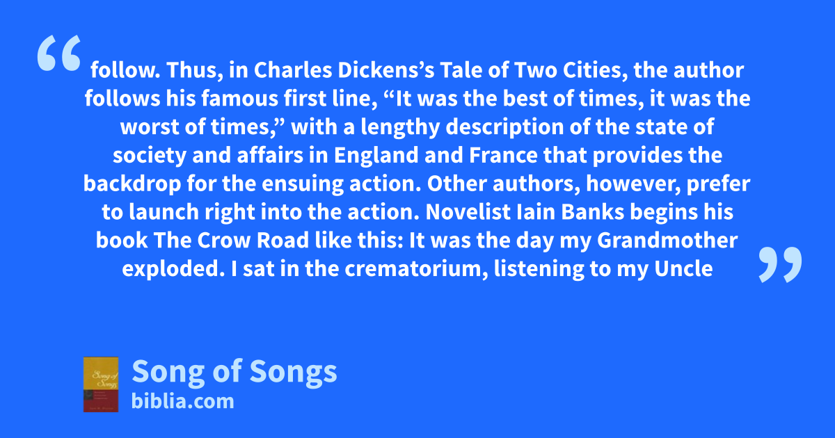 follow. Thus, in Charles Dickens’s Tale of Two Cities, the author follows his famous first line, “It was the best of times, it was the worst of times,” with a lengthy description of the state of society and affairs in England and France that provides the backdrop for the ensuing action. Other authors, however, prefer to launch right into the action. Novelist Iain Banks begins his book The Crow Road like this: It was the day my Grandmother exploded. I sat in the crematorium, listening to my Uncle