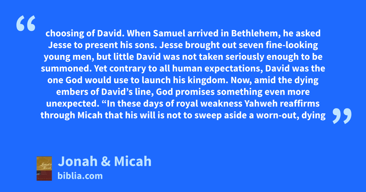 choosing of David. When Samuel arrived in Bethlehem, he asked Jesse to present his sons. Jesse brought out seven fine-looking young men, but little David was not taken seriously enough to be summoned. Yet contrary to all human expectations, David was the one God would use to launch his kingdom. Now, amid the dying embers of David’s line, God promises something even more unexpected. “In these days of royal weakness Yahweh reaffirms through Micah that his will is not to sweep aside a worn-out, dying