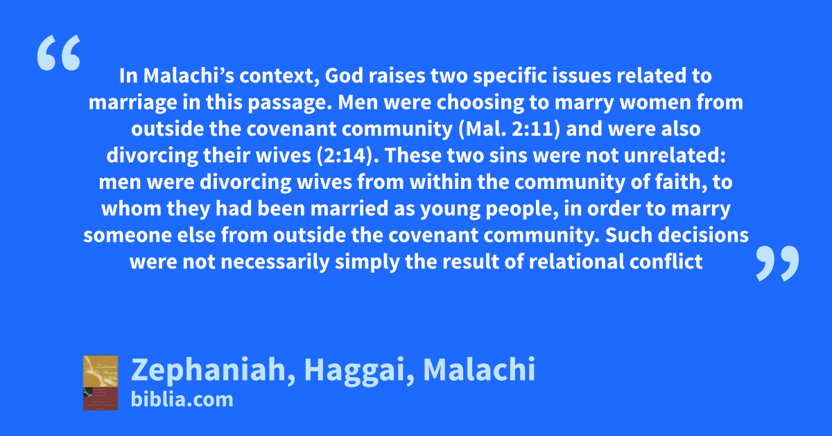 In Malachi’s context, God raises two specific issues related to marriage in this passage. Men were choosing to marry women from outside the covenant community (Mal. 2:11) and were also divorcing their wives (2:14). These two sins were not unrelated: men were divorcing wives from within the community of faith, to whom they had been married as young people, in order to marry someone else from outside the covenant community. Such decisions were not necessarily simply the result of relational conflict