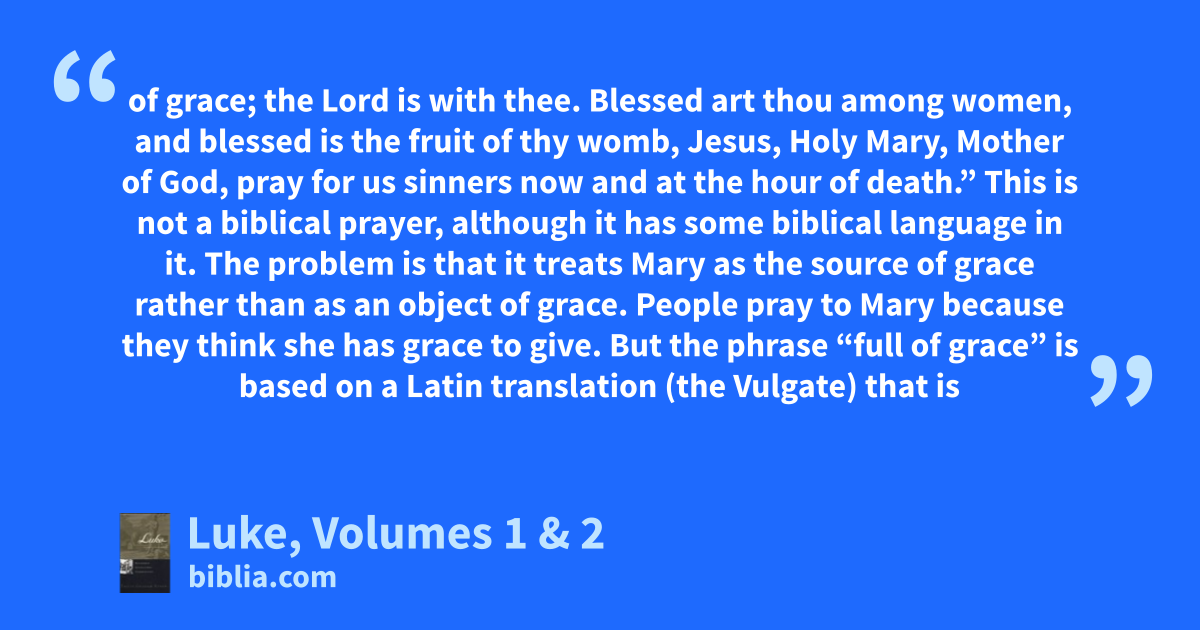 of grace; the Lord is with thee. Blessed art thou among women, and blessed is the fruit of thy womb, Jesus, Holy Mary, Mother of God, pray for us sinners now and at the hour of death.” This is not a biblical prayer, although it has some biblical language in it. The problem is that it treats Mary as the source of grace rather than as an object of grace. People pray to Mary because they think she has grace to give. But the phrase “full of grace” is based on a Latin translation (the Vulgate) that is