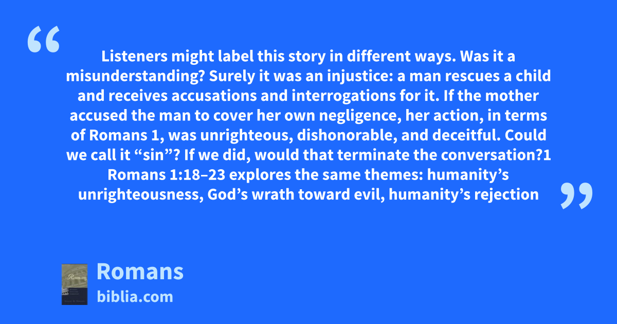 Listeners might label this story in different ways. Was it a misunderstanding? Surely it was an injustice: a man rescues a child and receives accusations and interrogations for it. If the mother accused the man to cover her own negligence, her action, in terms of Romans 1, was unrighteous, dishonorable, and deceitful. Could we call it “sin”? If we did, would that terminate the conversation?1 Romans 1:18–23 explores the same themes: humanity’s unrighteousness, God’s wrath toward evil, humanity’s rejection