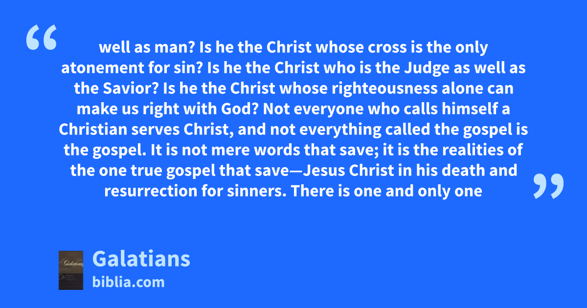 well as man? Is he the Christ whose cross is the only atonement for sin? Is he the Christ who is the Judge as well as the Savior? Is he the Christ whose righteousness alone can make us right with God? Not everyone who calls himself a Christian serves Christ, and not everything called the gospel is the gospel. It is not mere words that save; it is the realities of the one true gospel that save—Jesus Christ in his death and resurrection for sinners. There is one and only one