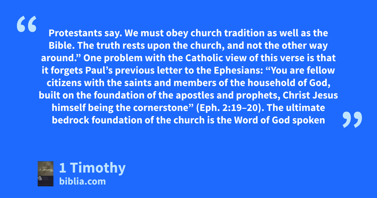 Protestants say. We must obey church tradition as well as the Bible. The truth rests upon the church, and not the other way around.” One problem with the Catholic view of this verse is that it forgets Paul’s previous letter to the Ephesians: “You are fellow citizens with the saints and members of the household of God, built on the foundation of the apostles and prophets, Christ Jesus himself being the cornerstone” (Eph. 2:19–20). The ultimate bedrock foundation of the church is the Word of God spoken