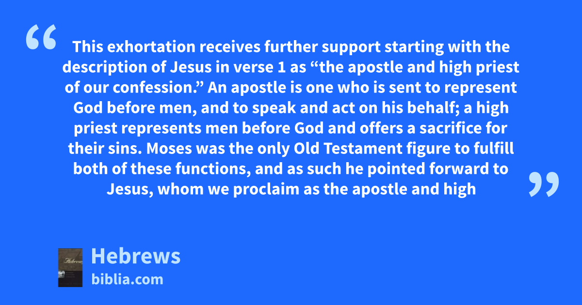 This exhortation receives further support starting with the description of Jesus in verse 1 as “the apostle and high priest of our confession.” An apostle is one who is sent to represent God before men, and to speak and act on his behalf; a high priest represents men before God and offers a sacrifice for their sins. Moses was the only Old Testament figure to fulfill both of these functions, and as such he pointed forward to Jesus, whom we proclaim as the apostle and high
