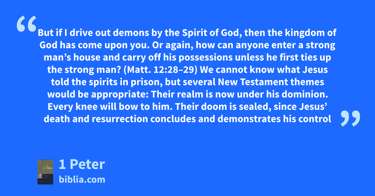 But if I drive out demons by the Spirit of God, then the kingdom of God has come upon you. Or again, how can anyone enter a strong man’s house and carry off his possessions unless he first ties up the strong man? (Matt. 12:28–29) We cannot know what Jesus told the spirits in prison, but several New Testament themes would be appropriate: Their realm is now under his dominion. Every knee will bow to him. Their doom is sealed, since Jesus’ death and resurrection concludes and demonstrates his control