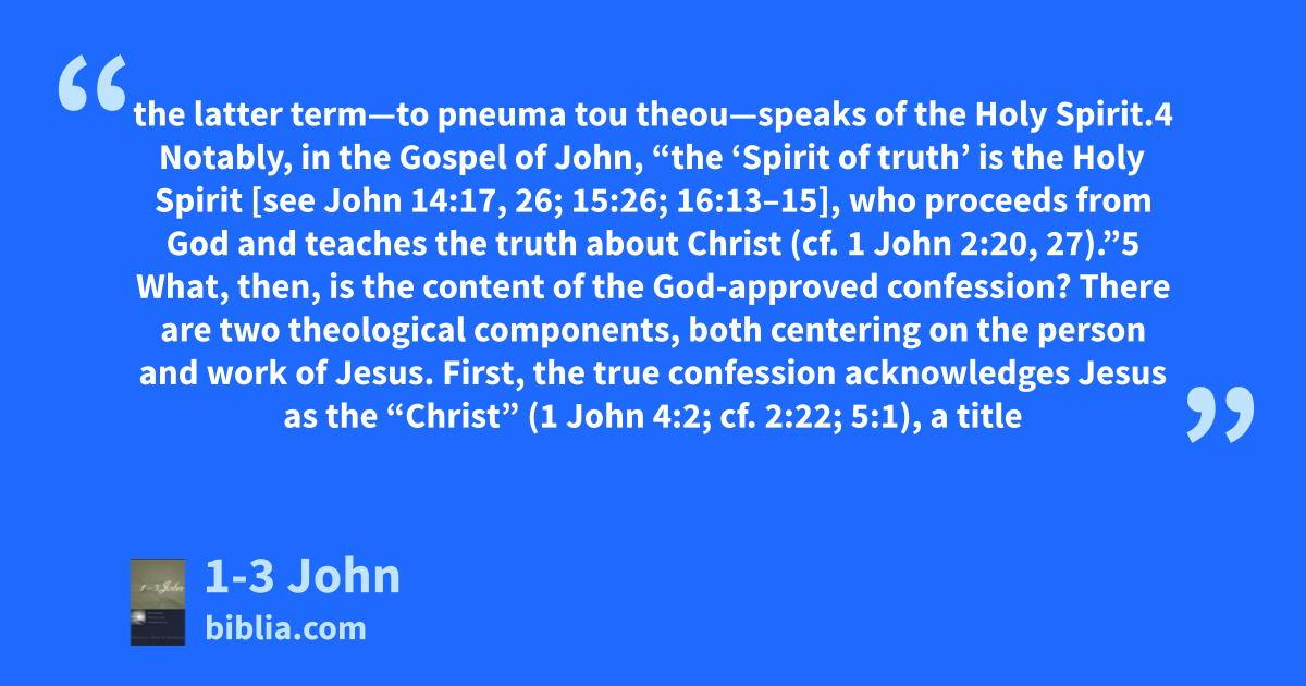 the latter term—to pneuma tou theou—speaks of the Holy Spirit.4 Notably, in the Gospel of John, “the ‘Spirit of truth’ is the Holy Spirit [see John 14:17, 26; 15:26; 16:13–15], who proceeds from God and teaches the truth about Christ (cf. 1 John 2:20, 27).”5 What, then, is the content of the God-approved confession? There are two theological components, both centering on the person and work of Jesus. First, the true confession acknowledges Jesus as the “Christ” (1 John 4:2; cf. 2:22; 5:1), a title