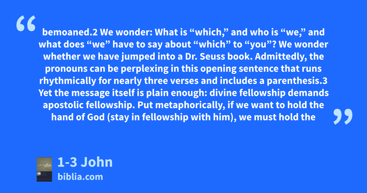 bemoaned.2 We wonder: What is “which,” and who is “we,” and what does “we” have to say about “which” to “you”? We wonder whether we have jumped into a Dr. Seuss book. Admittedly, the pronouns can be perplexing in this opening sentence that runs rhythmically for nearly three verses and includes a parenthesis.3 Yet the message itself is plain enough: divine fellowship demands apostolic fellowship. Put metaphorically, if we want to hold the hand of God (stay in fellowship with him), we must hold the