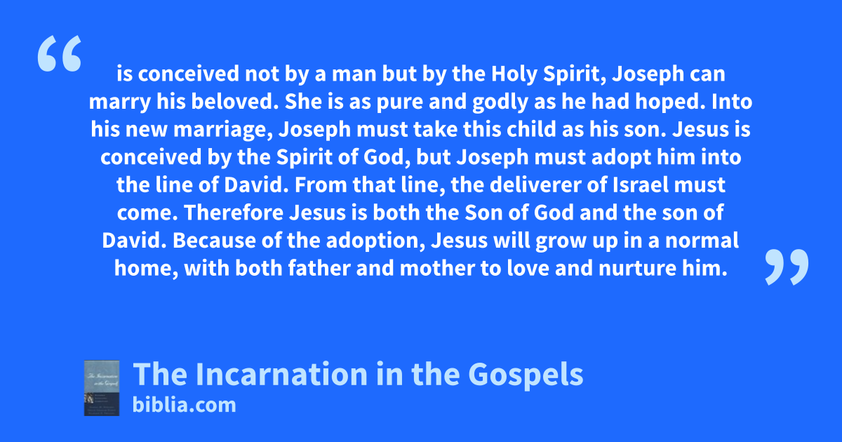 is conceived not by a man but by the Holy Spirit, Joseph can marry his beloved. She is as pure and godly as he had hoped. Into his new marriage, Joseph must take this child as his son. Jesus is conceived by the Spirit of God, but Joseph must adopt him into the line of David. From that line, the deliverer of Israel must come. Therefore Jesus is both the Son of God and the son of David. Because of the adoption, Jesus will grow up in a normal home, with both father and mother to love and nurture him.