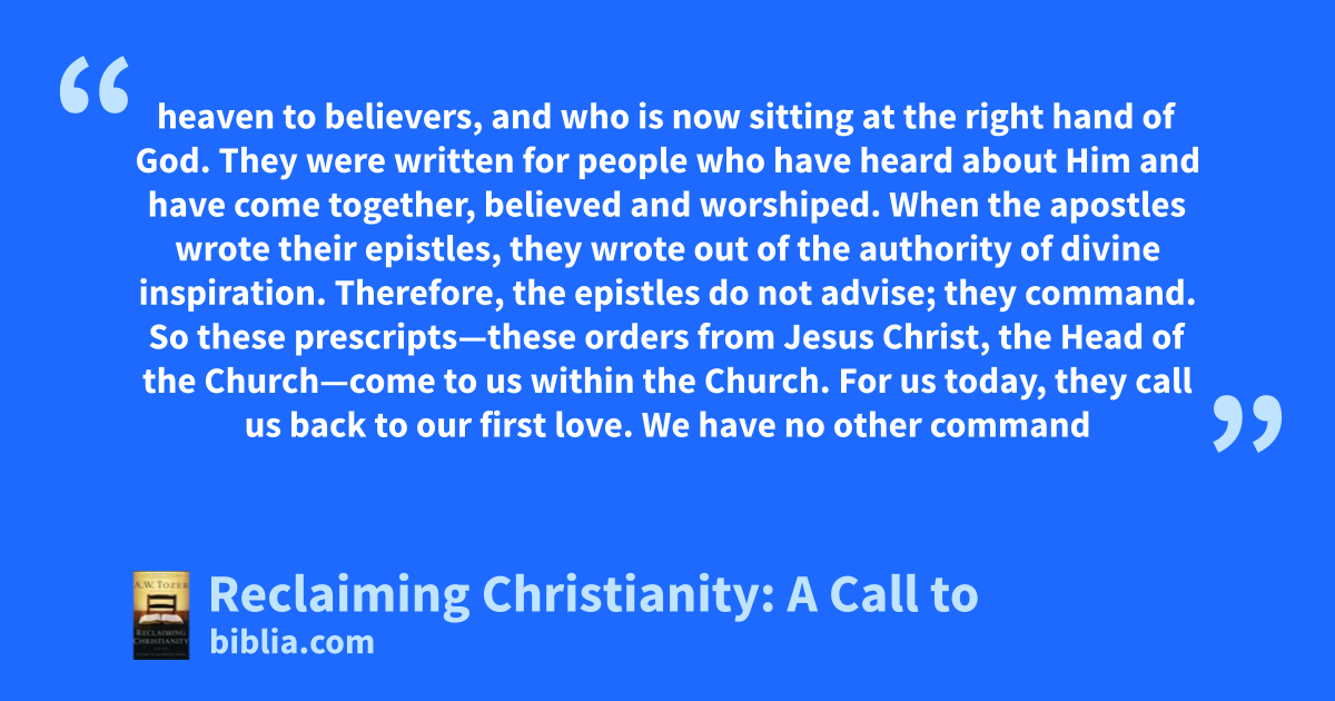 heaven to believers, and who is now sitting at the right hand of God. They were written for people who have heard about Him and have come together, believed and worshiped. When the apostles wrote their epistles, they wrote out of the authority of divine inspiration. Therefore, the epistles do not advise; they command. So these prescripts—these orders from Jesus Christ, the Head of the Church—come to us within the Church. For us today, they call us back to our first love. We have no other command