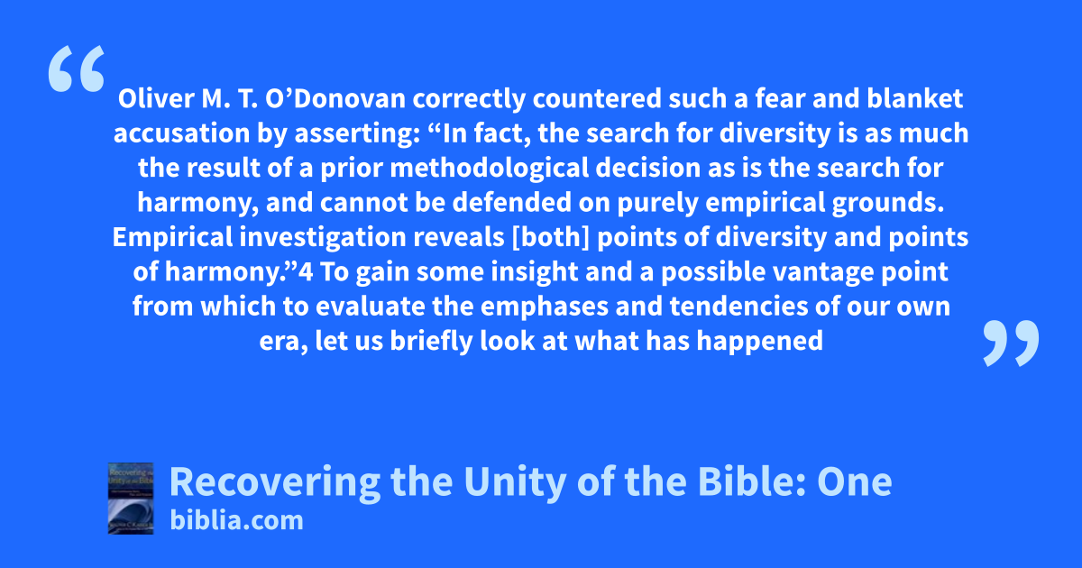 Oliver M. T. O’Donovan correctly countered such a fear and blanket accusation by asserting: “In fact, the search for diversity is as much the result of a prior methodological decision as is the search for harmony, and cannot be defended on purely empirical grounds. Empirical investigation reveals [both] points of diversity and points of harmony.”4 To gain some insight and a possible vantage point from which to evaluate the emphases and tendencies of our own era, let us briefly look at what has happened