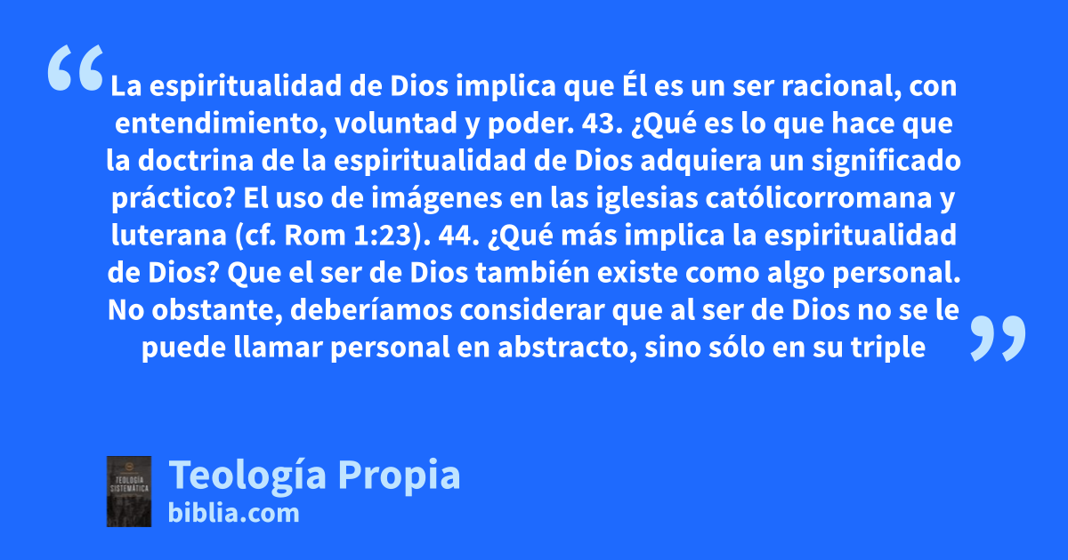 La espiritualidad de Dios implica que Él es un ser racional, con entendimiento, voluntad y poder. 43. ¿Qué es lo que hace que la doctrina de la espiritualidad de Dios adquiera un significado práctico? El uso de imágenes en las iglesias católicorromana y luterana (cf. Rom 1:23). 44. ¿Qué más implica la espiritualidad de Dios? Que el ser de Dios también existe como algo personal. No obstante, deberíamos considerar que al ser de Dios no se le puede llamar personal en abstracto, sino sólo en su triple