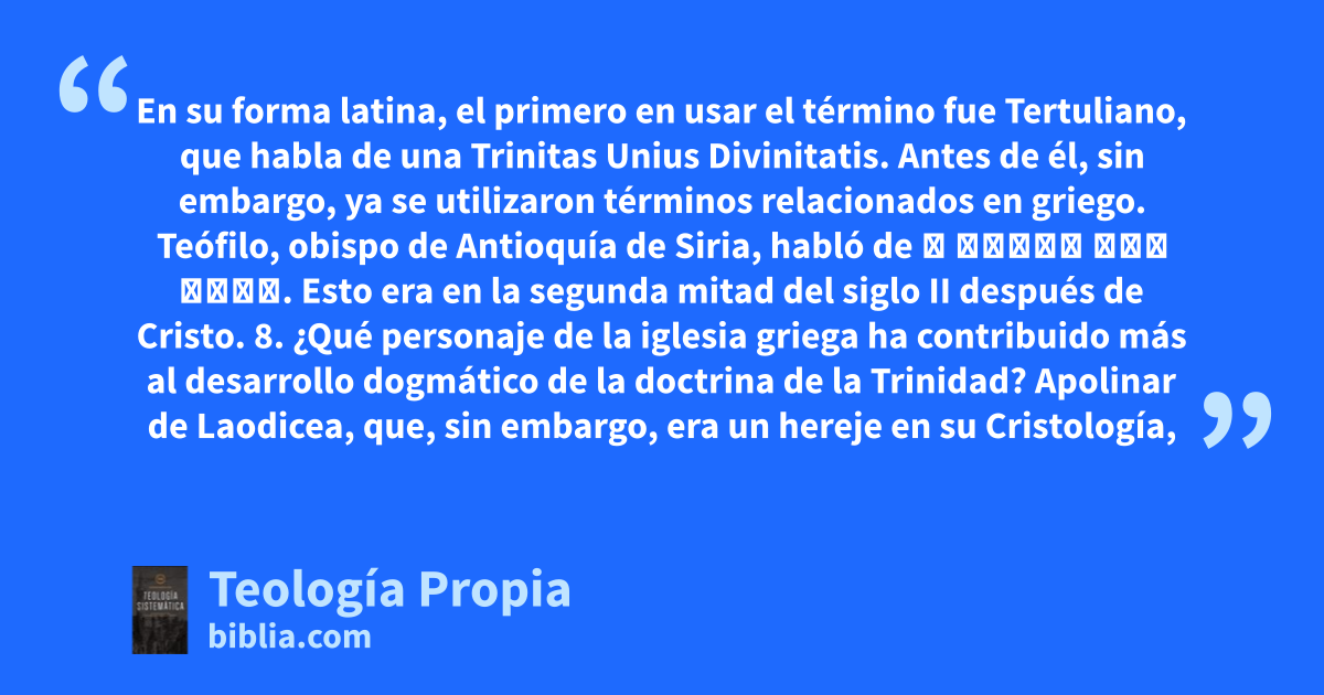 En su forma latina, el primero en usar el término fue Tertuliano, que habla de una Trinitas Unius Divinitatis. Antes de él, sin embargo, ya se utilizaron términos relacionados en griego. Teófilo, obispo de Antioquía de Siria, habló de ἡ τρίας τοῦ σεοῦ. Esto era en la segunda mitad del siglo II después de Cristo. 8. ¿Qué personaje de la iglesia griega ha contribuido más al desarrollo dogmático de la doctrina de la Trinidad? Apolinar de Laodicea, que, sin embargo, era un hereje en su Cristología,