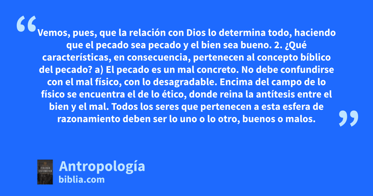 Vemos, pues, que la relación con Dios lo determina todo, haciendo que el pecado sea pecado y el bien sea bueno. 2. ¿Qué características, en consecuencia, pertenecen al concepto bíblico del pecado? a) El pecado es un mal concreto. No debe confundirse con el mal físico, con lo desagradable. Encima del campo de lo físico se encuentra el de lo ético, donde reina la antítesis entre el bien y el mal. Todos los seres que pertenecen a esta esfera de razonamiento deben ser lo uno o lo otro, buenos o malos.