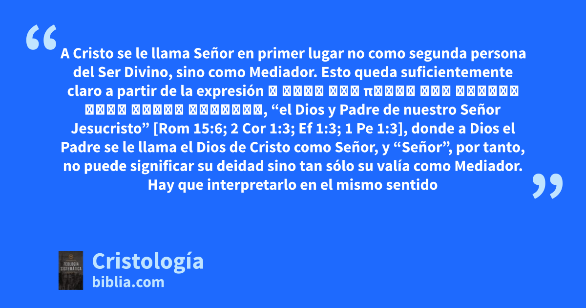 A Cristo se le llama Señor en primer lugar no como segunda persona del Ser Divino, sino como Mediador. Esto queda suficientemente claro a partir de la expresión ὁ θεὸς καὶ πατὴρ τοῦ κυρίου ἡμῶν Ἰησοῦ Χριστοῦ, “el Dios y Padre de nuestro Señor Jesucristo” [Rom 15:6; 2 Cor 1:3; Ef 1:3; 1 Pe 1:3], donde a Dios el Padre se le llama el Dios de Cristo como Señor, y “Señor”, por tanto, no puede significar su deidad sino tan sólo su valía como Mediador. Hay que interpretarlo en el mismo sentido