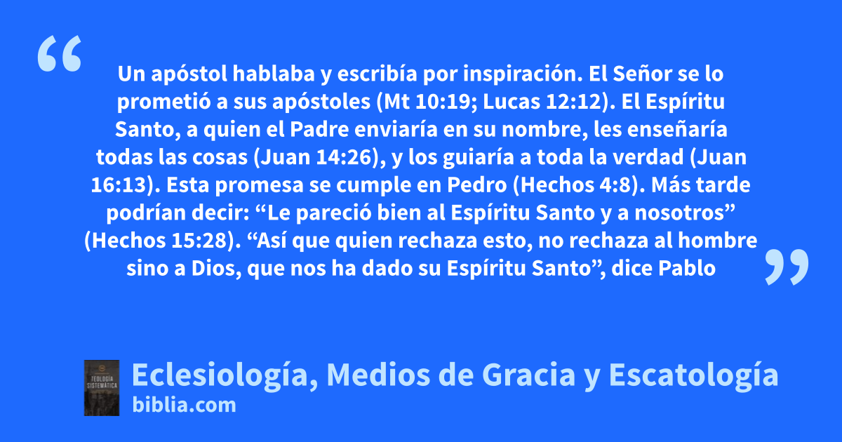 Un apóstol hablaba y escribía por inspiración. El Señor se lo prometió a sus apóstoles (Mt 10:19; Lucas 12:12). El Espíritu Santo, a quien el Padre enviaría en su nombre, les enseñaría todas las cosas (Juan 14:26), y los guiaría a toda la verdad (Juan 16:13). Esta promesa se cumple en Pedro (Hechos 4:8). Más tarde podrían decir: “Le pareció bien al Espíritu Santo y a nosotros” (Hechos 15:28). “Así que quien rechaza esto, no rechaza al hombre sino a Dios, que nos ha dado su Espíritu Santo”, dice Pablo