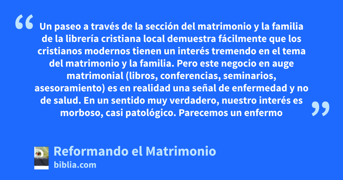 Un paseo a través de la sección del matrimonio y la familia de la librería cristiana local demuestra fácilmente que los cristianos modernos tienen un interés tremendo en el tema del matrimonio y la familia. Pero este negocio en auge matrimonial (libros, conferencias, seminarios, asesoramiento) es en realidad una señal de enfermedad y no de salud. En un sentido muy verdadero, nuestro interés es morboso, casi patológico. Parecemos un enfermo