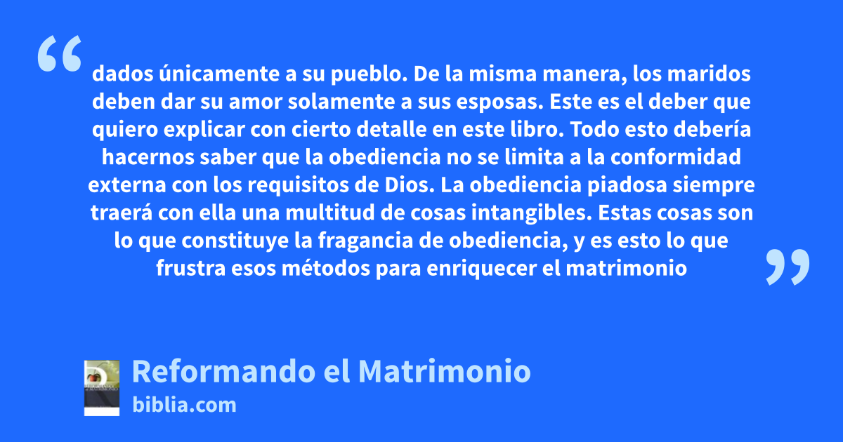 dados únicamente a su pueblo. De la misma manera, los maridos deben dar su amor solamente a sus esposas. Este es el deber que quiero explicar con cierto detalle en este libro. Todo esto debería hacernos saber que la obediencia no se limita a la conformidad externa con los requisitos de Dios. La obediencia piadosa siempre traerá con ella una multitud de cosas intangibles. Estas cosas son lo que constituye la fragancia de obediencia, y es esto lo que frustra esos métodos para enriquecer el matrimonio