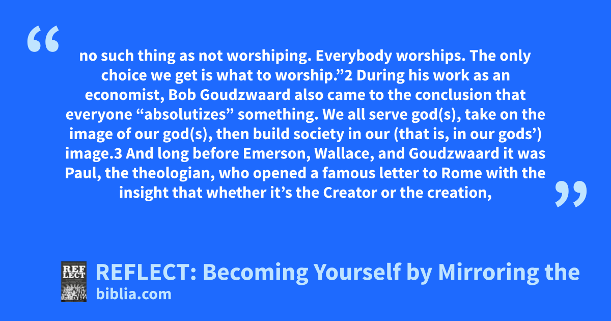 no such thing as not worshiping. Everybody worships. The only choice we get is what to worship.”2 During his work as an economist, Bob Goudzwaard also came to the conclusion that everyone “absolutizes” something. We all serve god(s), take on the image of our god(s), then build society in our (that is, in our gods’) image.3 And long before Emerson, Wallace, and Goudzwaard it was Paul, the theologian, who opened a famous letter to Rome with the insight that whether it’s the Creator or the creation,