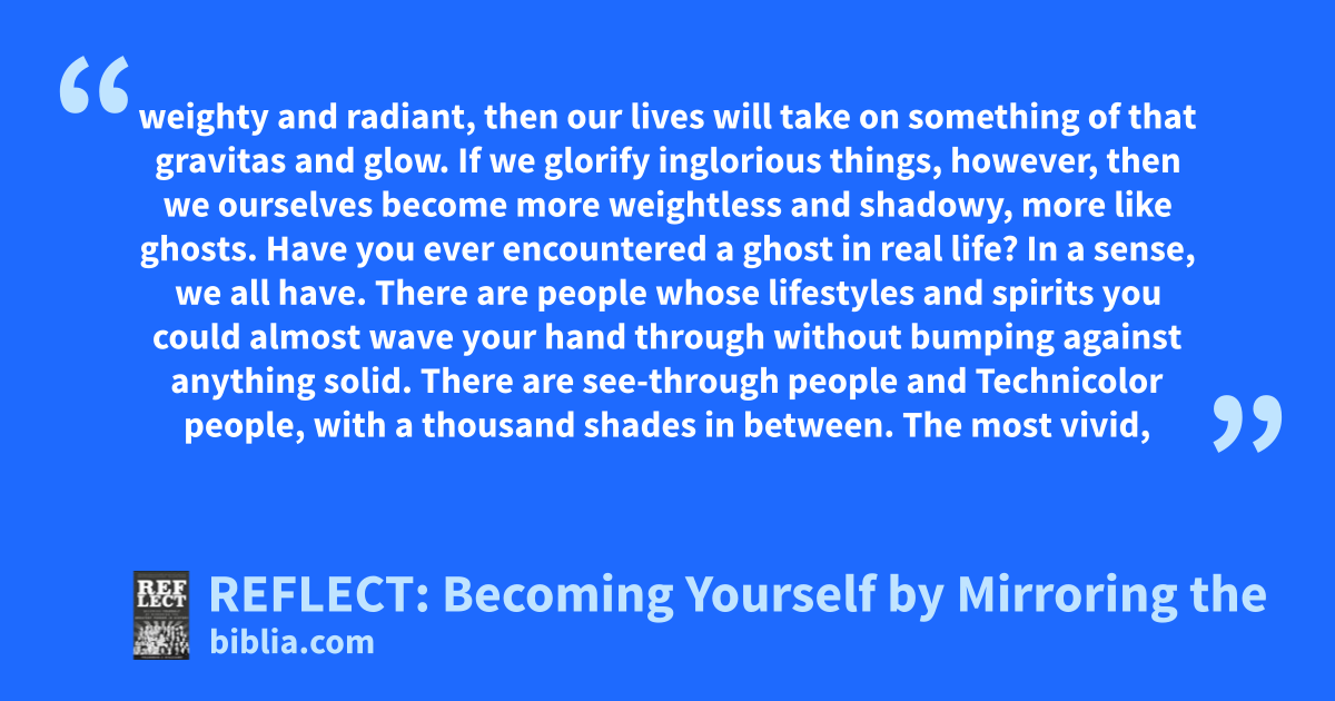 weighty and radiant, then our lives will take on something of that gravitas and glow. If we glorify inglorious things, however, then we ourselves become more weightless and shadowy, more like ghosts. Have you ever encountered a ghost in real life? In a sense, we all have. There are people whose lifestyles and spirits you could almost wave your hand through without bumping against anything solid. There are see-through people and Technicolor people, with a thousand shades in between. The most vivid,